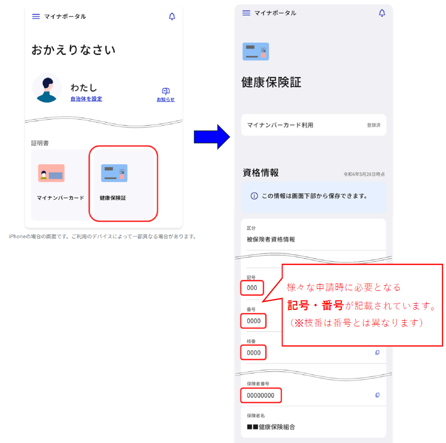 5.表示された健康保険証の資格情報の画面をスクロールして記号・番号等必要な情報を確認