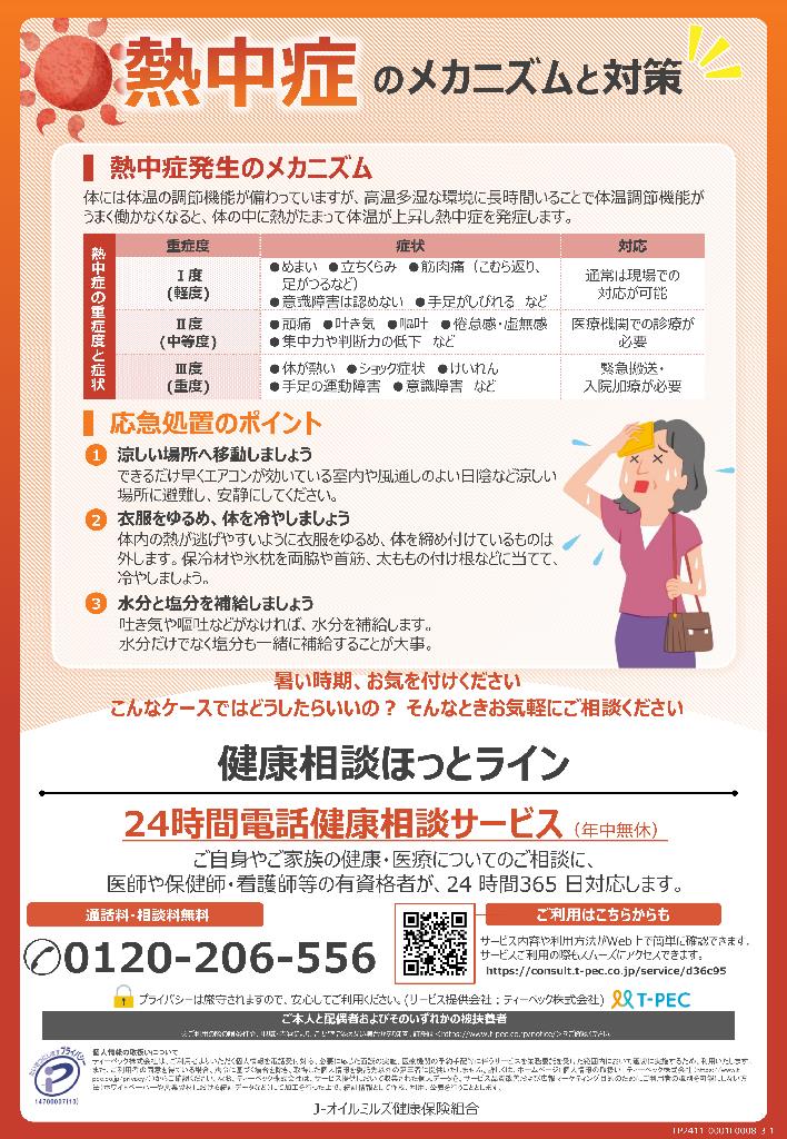 添付のチラシをご確認いただき、ご自身やご家族が、自宅や外出先で熱中症と思われる症状が現れたら早期に対応しましょう。 また、どうしたらよいか迷ってしまったら、速やかに健康相談ホットラインをご利用ください。