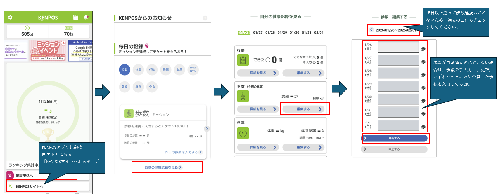 ③KENPOSトップページ➡『毎日の記録』➡『歩数』➡『自身の健康記録を見る』➡『編集する』をタップ